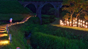 わいた温泉郷の山川温泉の共同浴場「ホタルの里温泉」付近の川沿いに竹灯籠を並べて穏やかな雰囲気の中でホタルを鑑賞します。