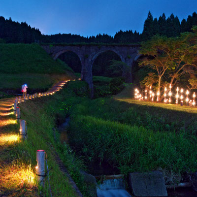 わいた温泉郷の山川温泉の共同浴場「ホタルの里温泉」付近の川沿いに竹灯籠を並べて穏やかな雰囲気の中でホタルを鑑賞します。