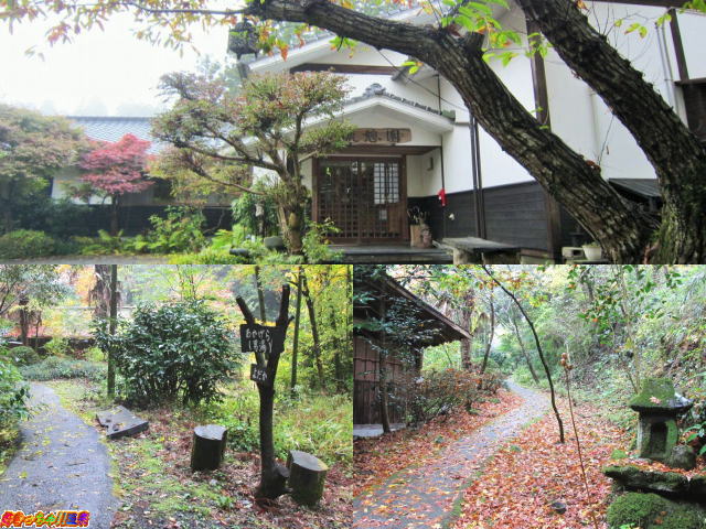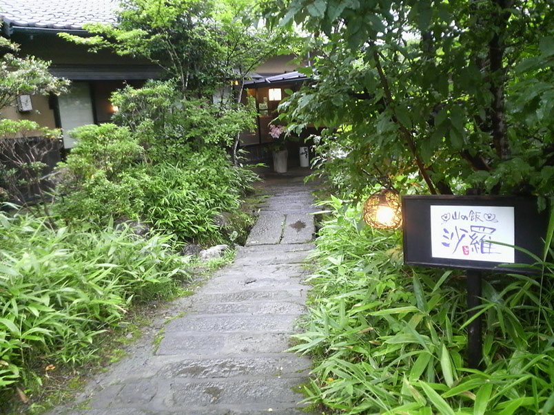 南小国は湯けむり処そしてそば処。田の原温泉と黒川温泉への道のならびにある「沙羅」。しゃらの木などの山の雑木と小さな水の流れがお出迎え。