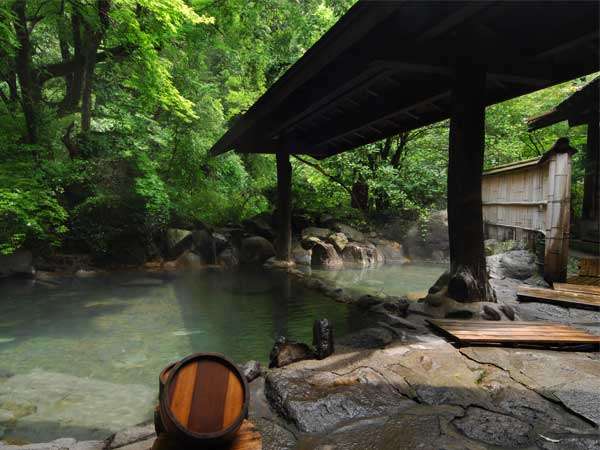 温泉棟へとつづく小路を抜けると、男性専用露天風呂と貸切風呂がございます。やや青みを帯びた湯と白く濁った湯の2つの源泉がそのままに注がれているため湯量も豊富で、開放感ある露天風呂では、自然と一体化した中でゆっくりと温泉をお楽しみいただけます。