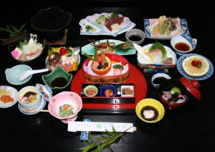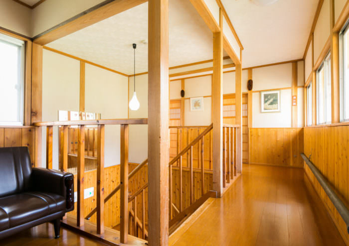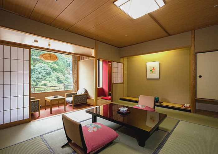 背戸屋の路地裏をのぼりつめた少し高台にたつふくみ山荘。昭和の時代からこの町のにぎわいと共に繁栄してきた温泉旅館です。高台にたつだけに、町を見晴らせる窓からの景色が魅力。なかでも、3階角のお部屋には川向こうの山並みと四季の風景を堪能できるように箱庭とテラスをご用意。