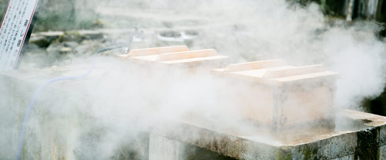 杖立温泉では、その湧きでる温熱の湯気をつかった「むし場」をいろんな場所で見かけることができます。