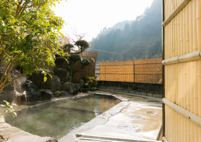 背戸屋の路地裏をのぼりつめた少し高台にたつふくみ山荘。昭和の時代からこの町のにぎわいと共に繁栄してきた温泉旅館です。高台にたつだけに、町を見晴らせる窓からの景色が魅力。なかでも、3階角のお部屋には川向こうの山並みと四季の風景を堪能できるように箱庭とテラスをご用意。